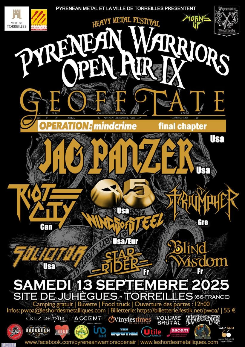 Pyrenean Warriors Open Air 9th – 13 septembre 2025 à Torreilles-Perpignan (66) Présentation du festival La veille Les groupes Dédicaces Présentation du festival Loin de moi de faire le spécialiste, il s’agit de ma seconde édition ! Mais quand vous regrettez à chacune d’elle d’avoir raté les autres, cela est bon signe sur la qualité d’accueil et de programmations. Qualité d’accueil ? De taille agréable pour l’agoraphophe que je pourrai être parfois, on a l’impression de se sentir en famille ! D’autant que le dress code y est respecté par le millier de convives. Point de licornes ou autres tenues LGBT, ici ce sont les vestes à patchs et même pantalons en spandex qui sonnent le ralliement. Il est même agréable de voir autant de jeunes s’accaparer cet héritage. Sympa ! Trois trucks se démènent pour nous ravitailler avec qualité ! Certes, les prix ont un peu augmenté, sauf ceux de la buvette qui propose une bière locale, mais la cuisine y est réussie avec comme indicateur, des frites fraiches ! L’espace est suffisamment ample pour ne pas se sentir dans une boite de sardines. Le cadre est d’ailleurs très agréable avec le […]