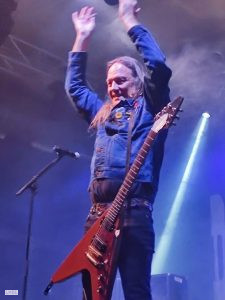 Laust qui jusqu’à présent s’appliquait à tenir un beat efficace façon AC/DC ou STATUS QUO, se lâche comme un puma et dévoile aussi par sa façon de tenir sa baguette, une technique issue du jazz. On vivra là un véritable échange ; et de la fosse : un face à face digne d’un duel de Western : un moment que je n’oublierai pas : fabuleux !