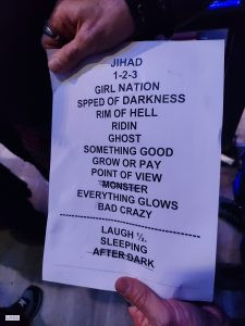 On ressentira que la set list, tout comme cet album, se fait moins hard punk que d’habitude, en toute relativité. Mais ceci est peut-être du fait que deux morceaux ne seront pas interprétés ce soir. En effet, le groupe commencera avec un peu moins de 10 minutes de retard. Selon un fan, les loustics seraient allés faire un tour en ville dans l’après midi et se seraient donc fait surprendre par le délai. Mais vous pouvez vous rattraper sur leur quatrième album live tout fraichement publié et comprenant des morceaux de l’album Speed Of Darkness sorti récemment et inclus dans mon Top 2024 (lire ? clique ici).